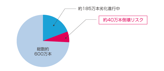 全国に総数で約600万本の照明柱が存在し、約185万本は劣化が進んでおり、そのうち約40万本は倒壊リスクが高いと言われてます。(出典:自治体通信2020年10月号)